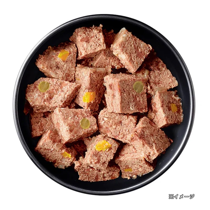原材料・成分:肉類(チキン等)、野菜類(いんげん等)、さつまいも、チコリー繊維、ビートパルプ、ハーブ、ビタミン類(B1、B5、B6、B12、D3、E、コリン、葉酸)、ミネラル類(Ca、Cl、Cu、I、K、Mg、Mn、Na、P、Se、Zn)、増粘多糖類
