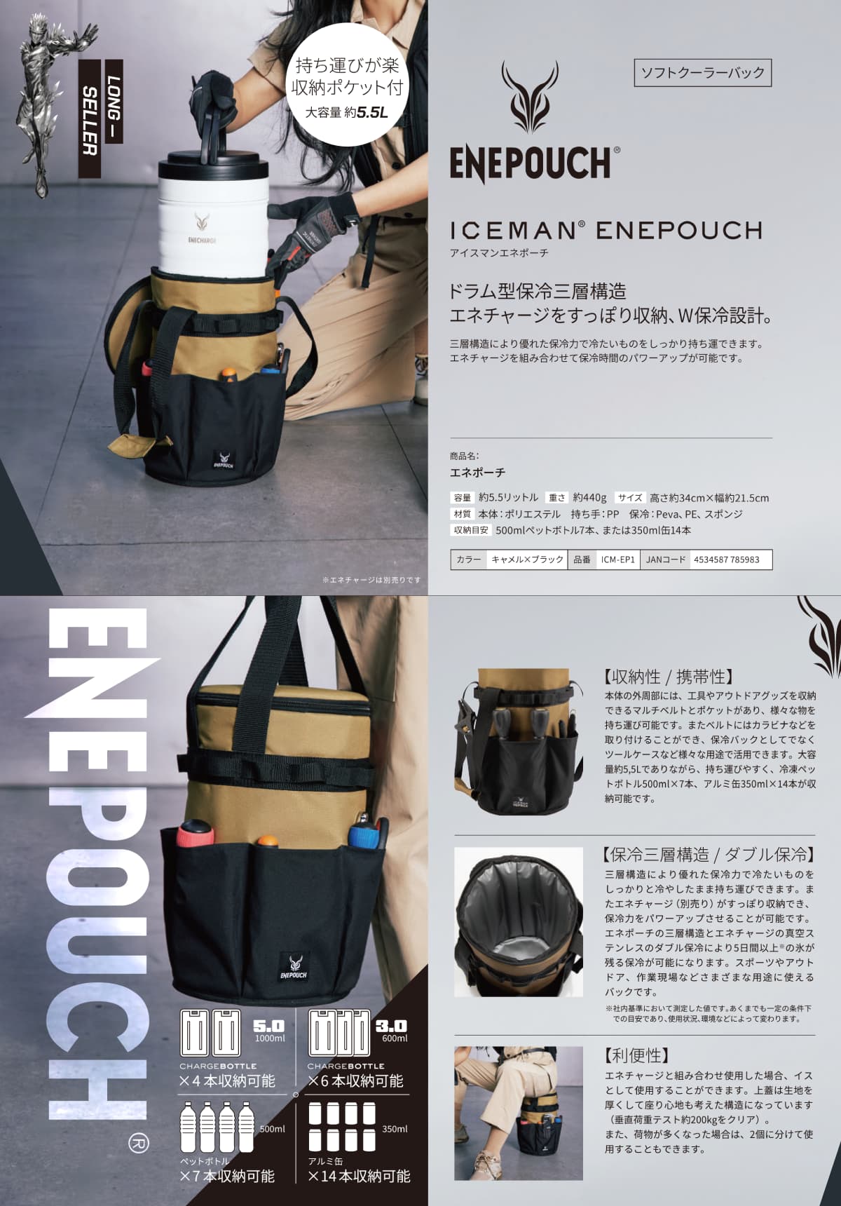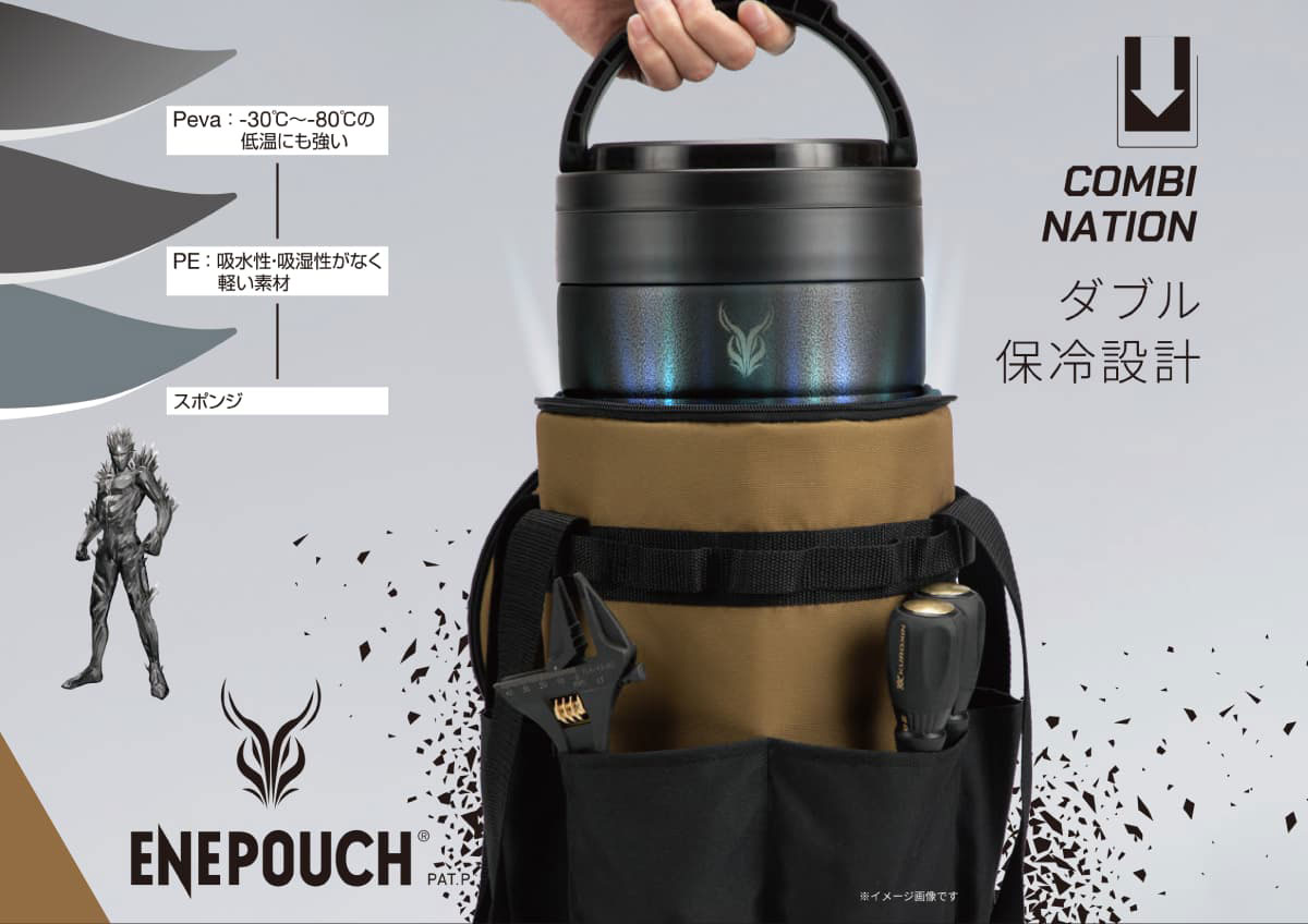 ●三層構造の生地で保冷効果抜群 ●作業、スポーツ、アウトドアなど、さまざまな用途に使用可能なバッグです。 ●本体外周部のポケットには、工具、アウトドアギアの収納や、カラビナなどの取り付け可能なベルト付 ●エネチャージと、エネポーチの組み合わせで使用した場合、椅子として使用可能(耐荷重:200kg) ●350mlのアルミ缶、最大8本収納可能 ●600mのlペットボトル、最大4本収納可能
