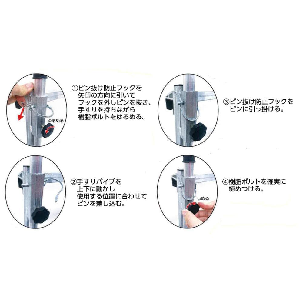 2、手すりパイプを上下に動かし使用する位置に合わせてピンを差し込む。