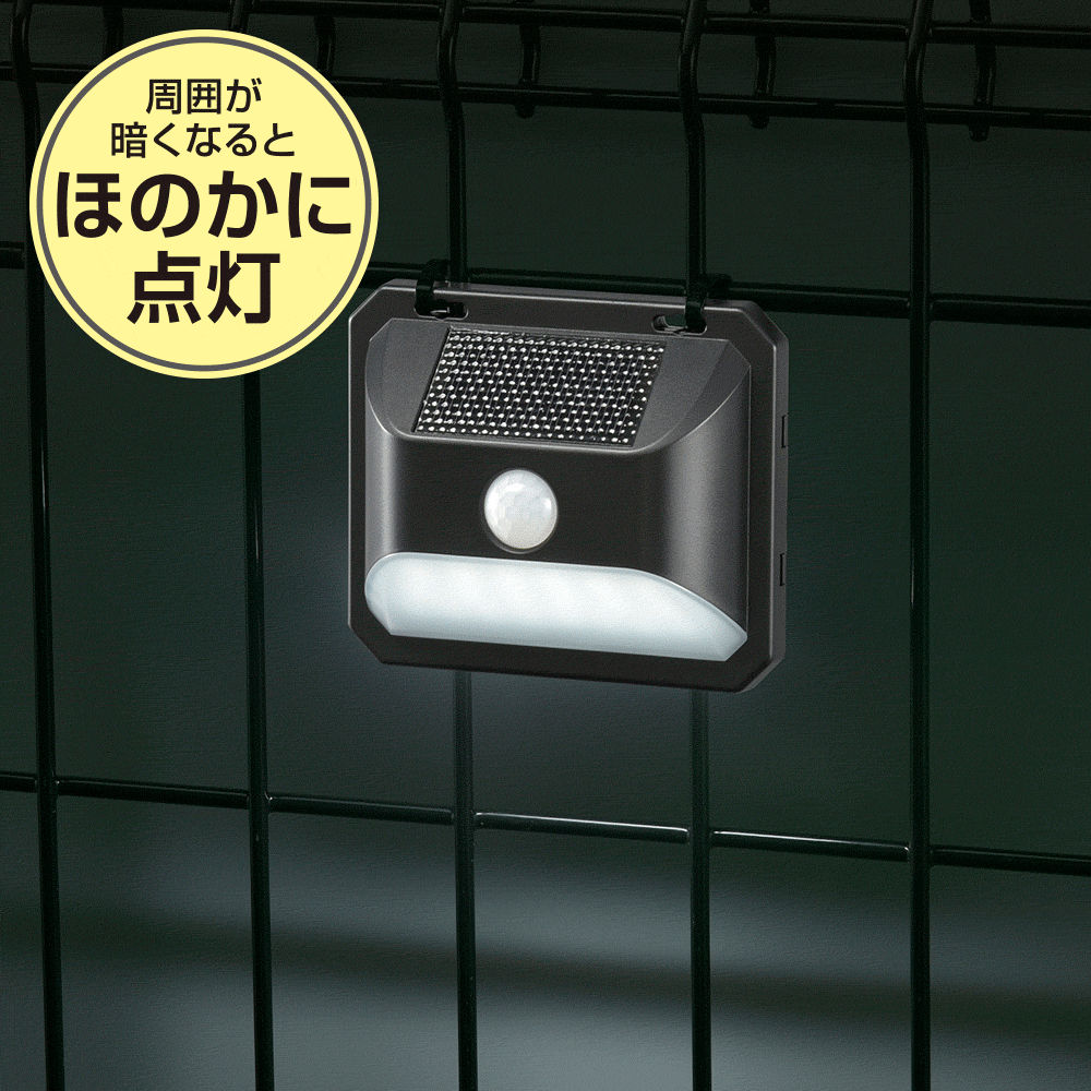 "●明暗+人感センサーで周囲が暗くなるとほのかに点灯、人が近づくとしっかり点灯 ●コンセントがない場所に設置できる ●ソーラー発電 ●防じん防水性能はIP65 ●簡単取付"