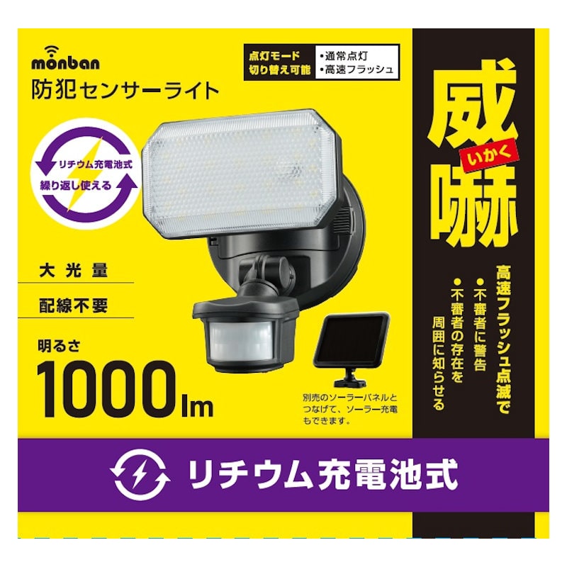 "・通常モードと防犯モードを切替て、日常照明と威嚇防犯が選択できる、さらに便利、さらに安心できる。 ・充電式なので、煩雑な電池の買替が不要 ・充電電池を安全性が高いリン酸リチウムイオン電池を採用で、さらに長く、安心に使用できる ・センサーとライト部を最適な角度に調整可能。 ・別売のソーラーパネルを使えば、さらに長時間の大光量を保つ"