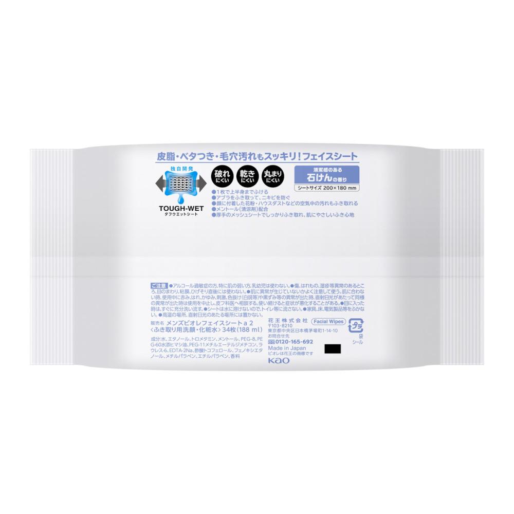 独自開発の「タフウエットシート」採用で、丸まりにくい・乾きにくい・破れにくいフェイスシート! 1枚で上半身までふける。 アブラをふき取って、ニキビを防ぐ。 顔に付着した花粉・ハウスダストなどの空気中の汚れもふき取れる。 メントール(清涼剤)配合。 厚手のメッシュシートでしっかりふき取れ、肌にやさしいふき心地。 清潔感のある石けんの香り。
