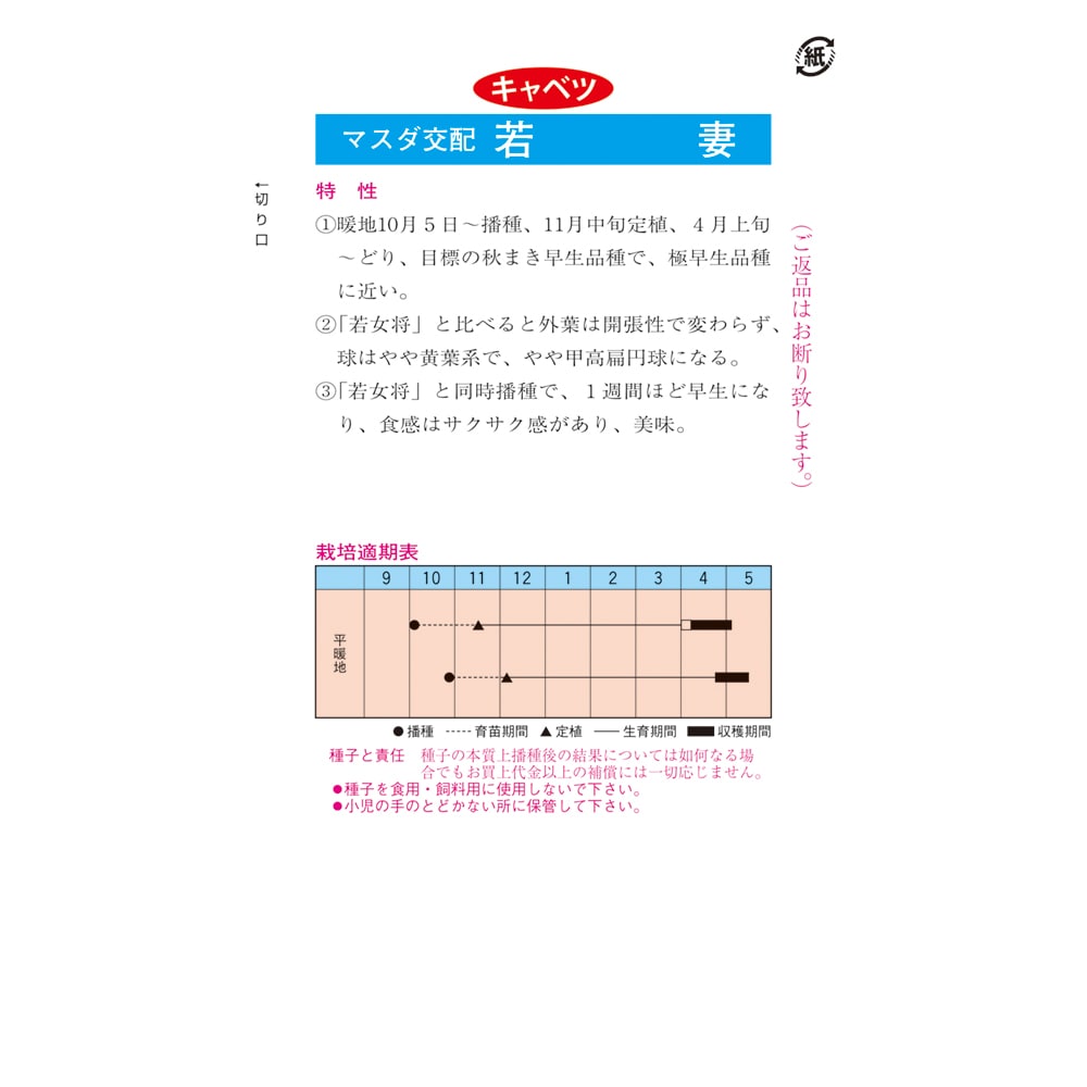 ◎ 暖地10月5日~ 播種、11月中旬定植、4月上旬~どり、目標の秋まき早生品種で、極早生品種に近い。