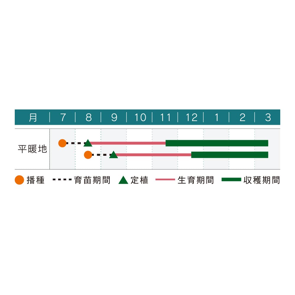 ◎一般地7月中旬~8月中旬播種、11月中旬~3月中旬まで、その都度かきとりながら収穫していく