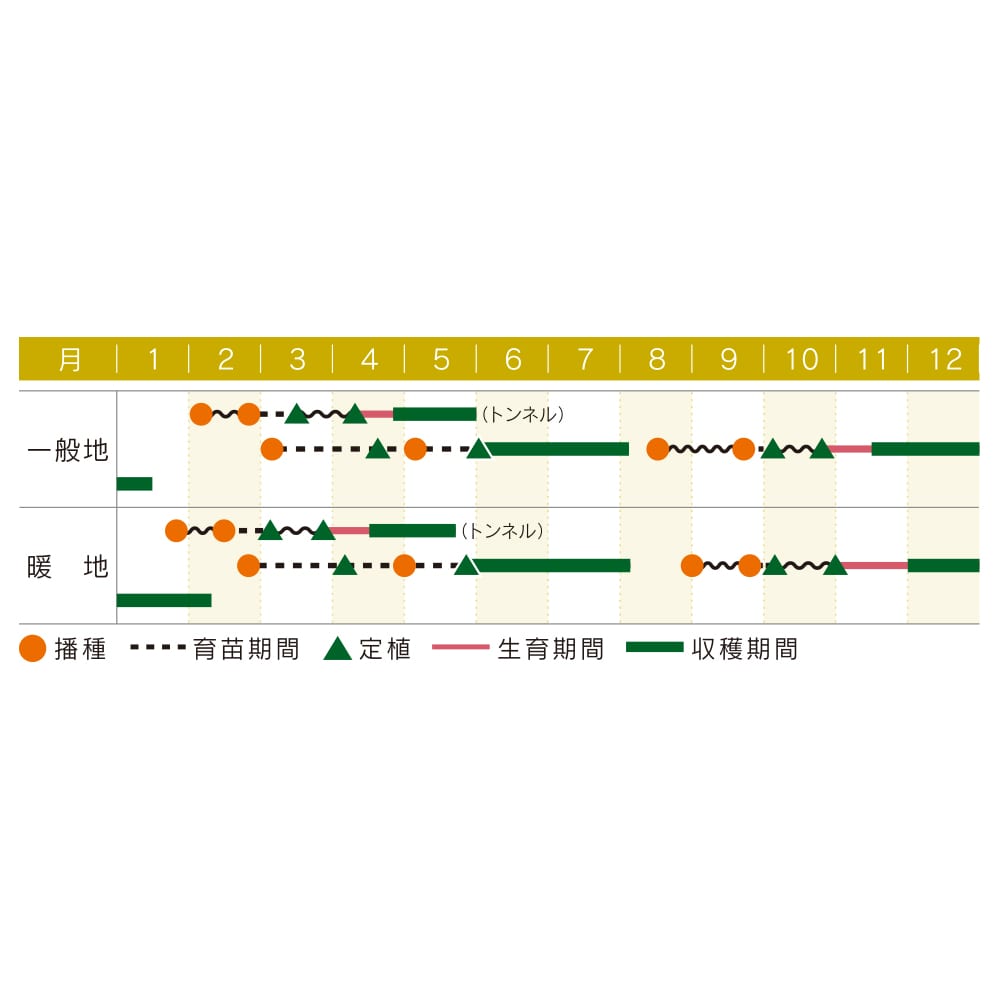◎ 草勢が強く、栽培しやすく定植後60日前後で収穫でき、肥大性が抜群で抽苔が遅い。