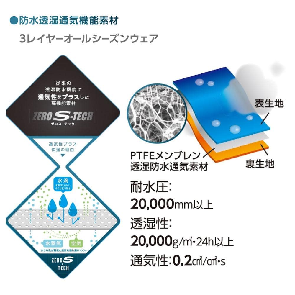 ●ZEROS-TECH(ゼロ・ステック):透湿防水性生地に通気性を加えた高性能素材 生地の表面上に水滴も入らないくらい小さな孔で加工され、防水するにもかかわらず、 内部の蒸気と空気は外に通すので蒸れにくく、快適環境を維持します。 ●耐水圧:20000mm以上 本格的な雨の中での長時間の着用に耐えられます。 大雨の中での作業、登山にも使用できます。 ●透湿性:20000g/m2・24h以上 激しい運動でも蒸れない透湿性。 例:ランニングなどの激しい運動で1時間あたり発汗量/約1000g(24時間で約24000g) ●通気性調整可能、ハイサイド ベンチレーションポケット 脇の大きなポケットの内側はメッシュで風の通りを調整できます。 ●防水ファスナーで雨水をガード ●フード収納可能、フォールド・イン・フード ●フードのサイズ調整可能、フードフィッティング 【構成】 ・ポリエステル100%(PTFEラミネート) 、はっ水(水をはじきやすい)