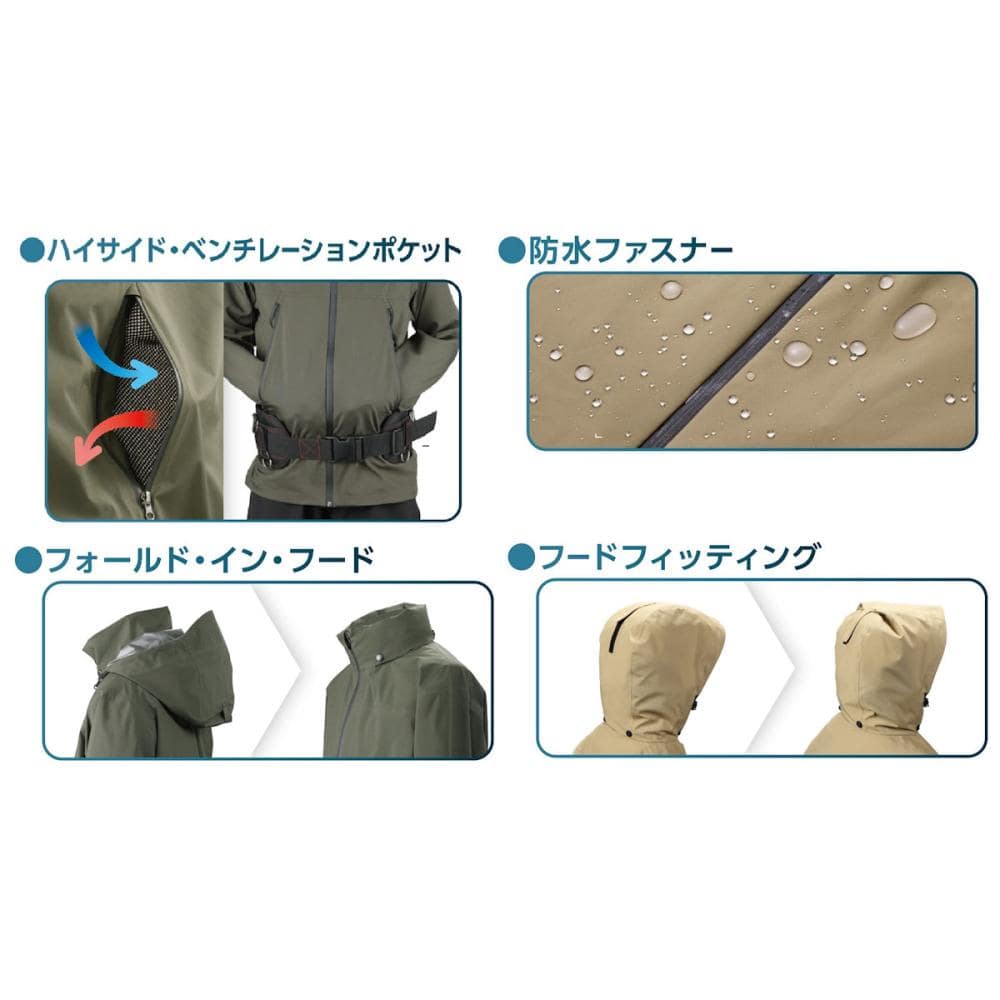 ●ZEROS-TECH(ゼロ・ステック):透湿防水性生地に通気性を加えた高性能素材 生地の表面上に水滴も入らないくらい小さな孔で加工され、防水するにもかかわらず、 内部の蒸気と空気は外に通すので蒸れにくく、快適環境を維持します。 ●耐水圧:20000mm以上 本格的な雨の中での長時間の着用に耐えられます。 大雨の中での作業、登山にも使用できます。 ●透湿性:20000g/m2・24h以上 激しい運動でも蒸れない透湿性。 例:ランニングなどの激しい運動で1時間あたり発汗量/約1000g(24時間で約24000g) ●通気性調整可能、ハイサイド ベンチレーションポケット 脇の大きなポケットの内側はメッシュで風の通りを調整できます。 ●防水ファスナーで雨水をガード ●フード収納可能、フォールド・イン・フード ●フードのサイズ調整可能、フードフィッティング 【構成】 ・ポリエステル100%(PTFEラミネート) 、はっ水(水をはじきやすい)