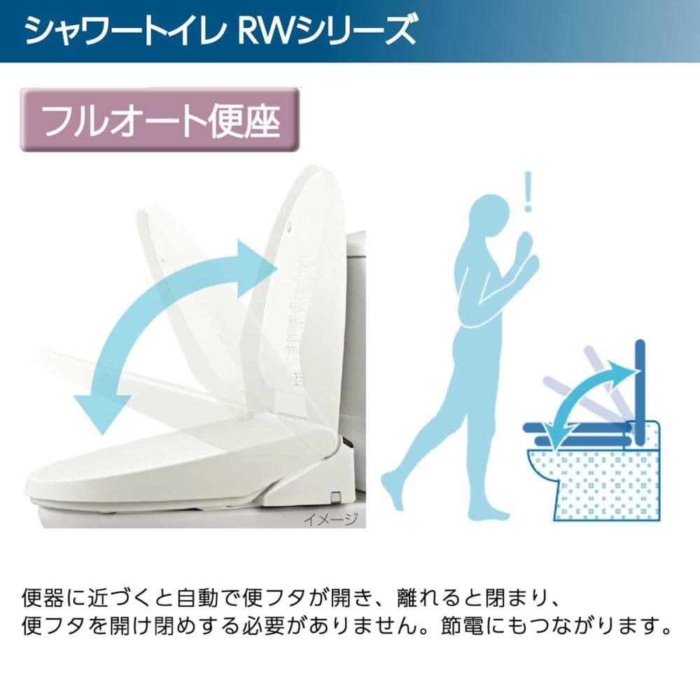 ●フルオート便座:便器に近づくと自動で便フタが開き、離れると閉まり、便フタの開け閉めがないので、腰への負担が軽減されます。節電にもつながります。