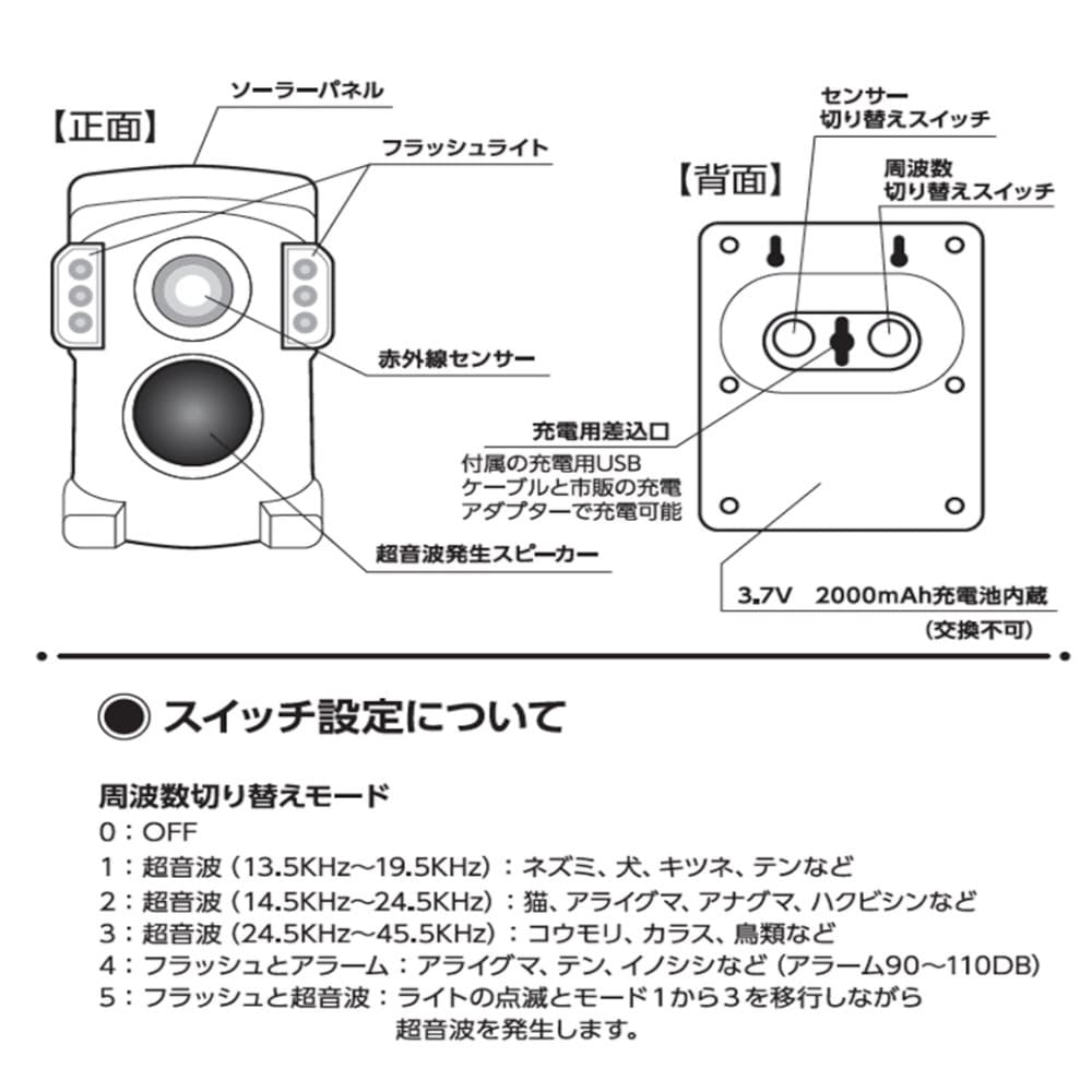 2:超音波(14.5KHz~24.5KHz):猫、アライグマ、アナグマ、ハクビシンなど