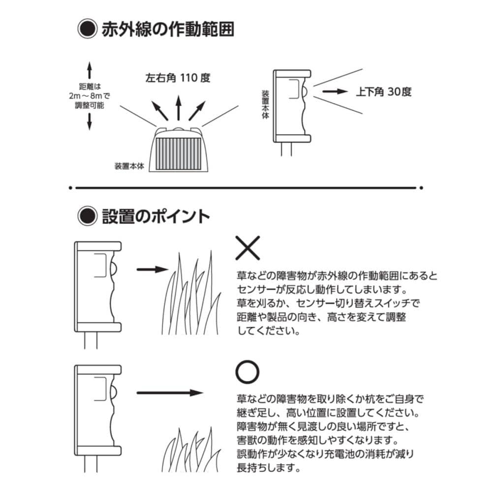 ●有効範囲:左右110度、上下30度 ・検知距離 約8m