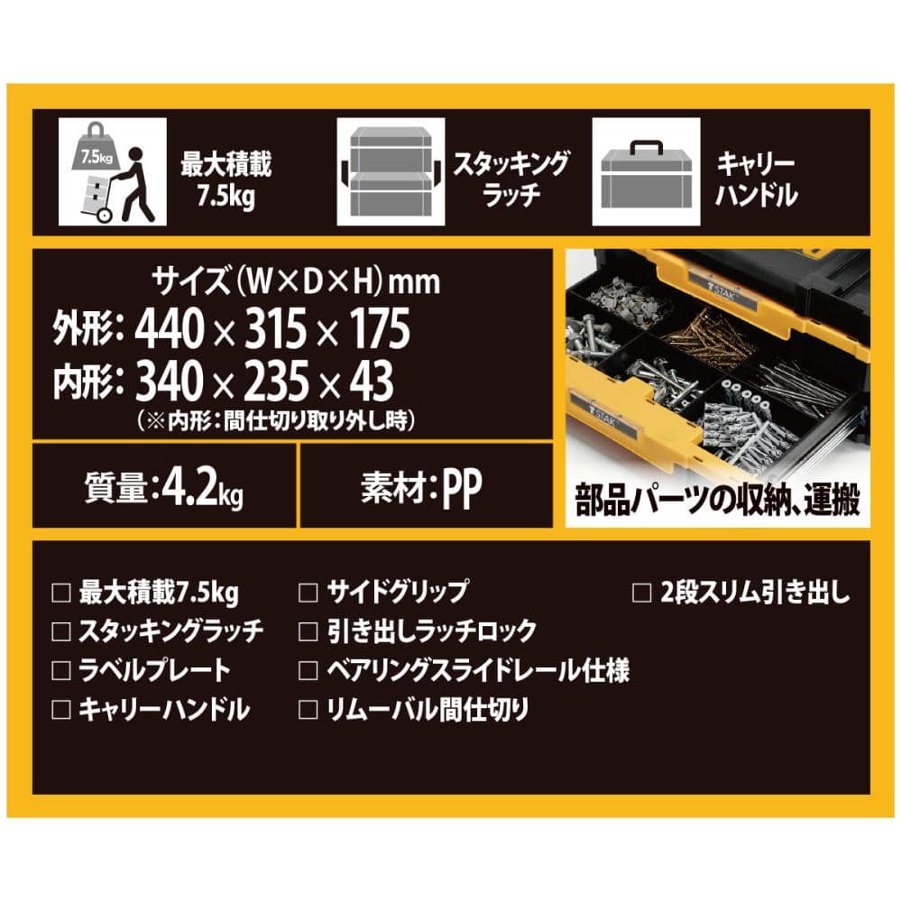 "●TSTAKシリーズの引き出しタイプです。 ●2段引き出しタイプのパーツチェストでベアリングレールで快適スライドします。 ●自由に仕切りを調整できる2段引出しタイプチェストです。 ●部品やパーツ・工具の収納・運搬に"