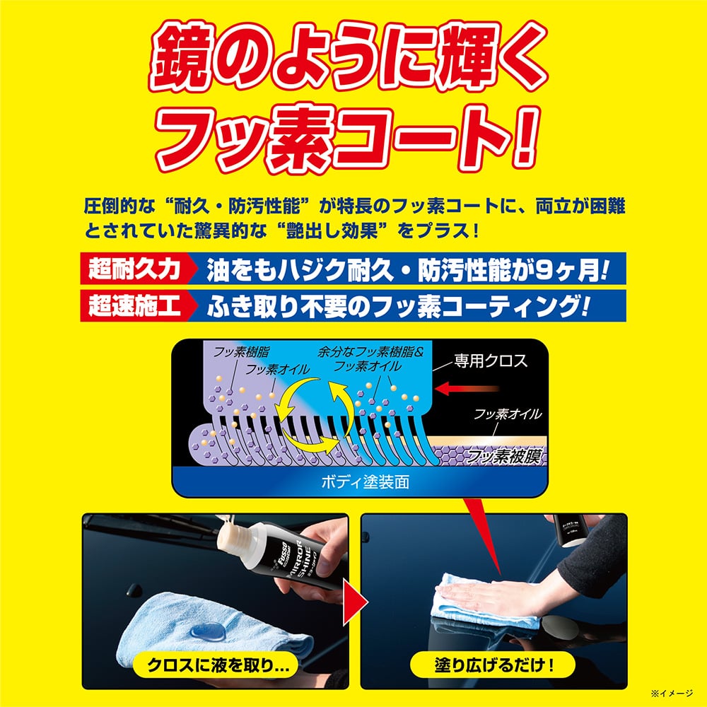 付属のマイクロファイバークロスに液を取り、塗り広げていくだけ。ふき取り不要のスピードコーティング。