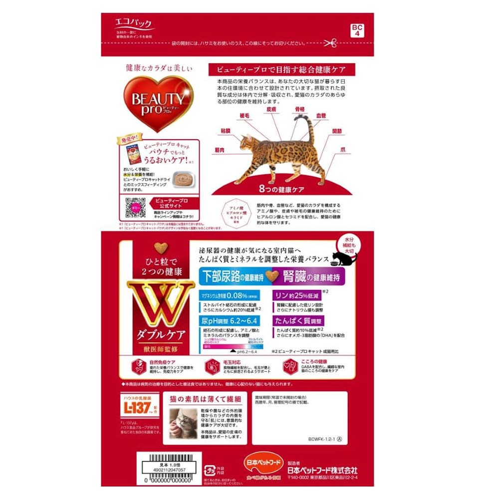 原材料・成分:穀類(トウモロコシ、小麦粉、コーングルテンミール、パン粉)、肉類(牛肉粉、豚肉粉)、油脂類(動物性油脂、植物性油脂)、フィッシュパウダー、オリゴ糖、アップルファイバー(セラミド源)、海藻粉末(DHA源)、乳酸菌加熱菌体、GABA、ミネラル類(カルシウム、カリウム、ナトリウム、クロライド、銅、亜鉛、ヨウ素)、アミノ酸類(シスチン、タウリン、トリプトファン、メチオニン)、ビタミン類(A、B1、B2、B6、B12、D、E、K、ニコチン酸、パントテン酸、葉酸、コリン)、pH調整剤、酵母細胞壁(食物繊維源)、酸化防止剤(ミックストコフェロール、ローズマリー抽出物)、ヒアルロン酸