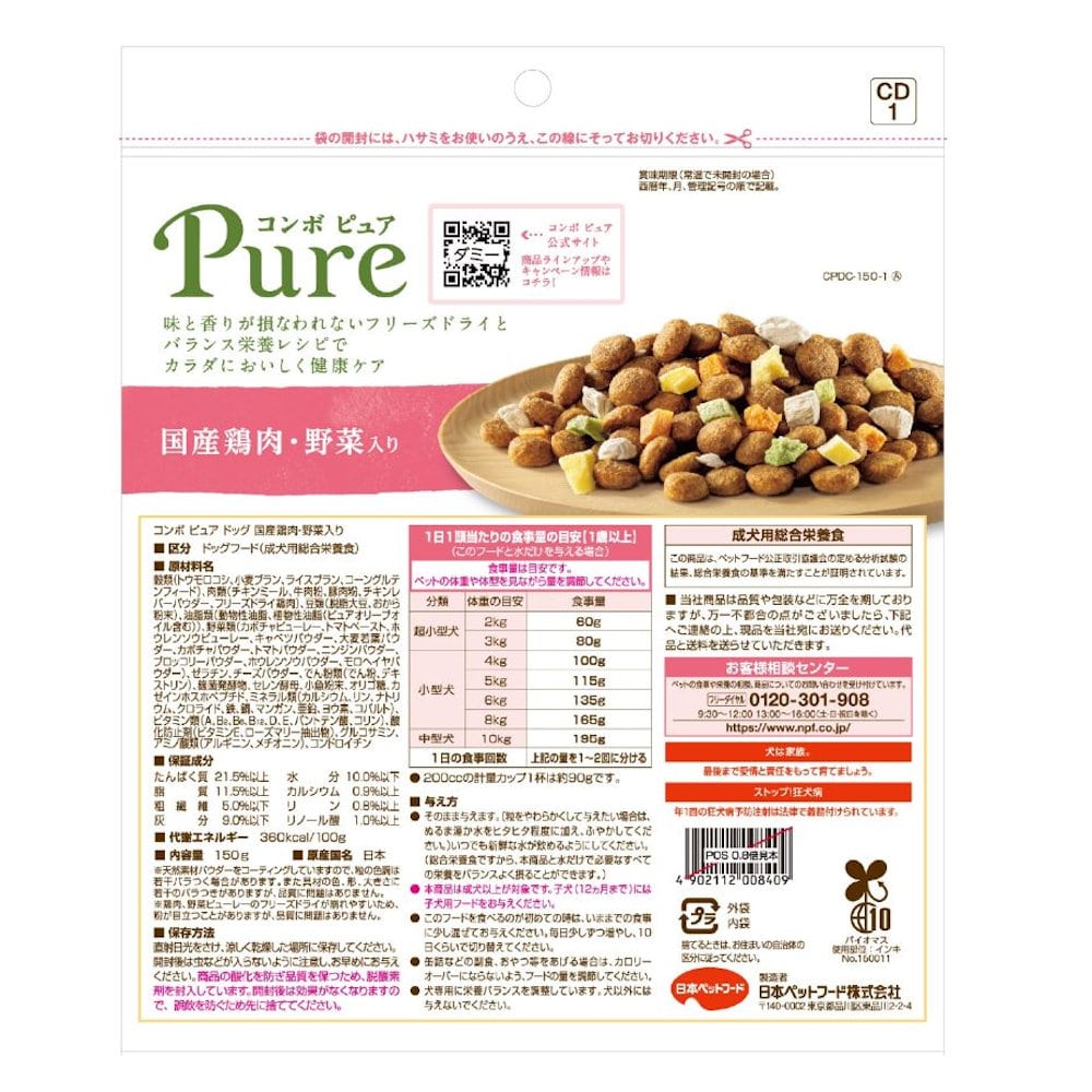 原材料・成分:穀類(トウモロコシ、小麦ブラン、ライスブラン、コーングルテンフィード)、肉類(チキンミール、牛肉粉、豚肉粉、チキンレバーパウダー、フリーズドライ鶏肉)、豆類(脱脂大豆、おから粉末)、油脂類(動物性油脂、植物性油脂(ピュアオリーブオイル含む))、野菜類(カボチャピューレー、トマトペースト、ホウレンソウピューレー、キャベツパウダー、大麦若葉パウダー、カボチャパウダー、トマトパウダー、ニンジンパウダー、ブロッコリーパウダー、ホウレンソウパウダー、モロヘイヤパウダー)、ゼラチン、チーズパウダー、でん粉類(でん粉、デキストリン)、麹菌発酵物、セレン酵母、小魚粉末、オリゴ糖、カゼインホスホペプチド、ミネラル類(カルシウム、リン、ナトリウム、クロライド、鉄、銅、マンガン、亜鉛、ヨウ素、コバルト)、ビタミン類(A、B2、B6、B12、D、E、パントテン酸、コリン)、酸化防止剤(ビタミンE、ローズマリー抽出物)、グルコサミン、アミノ酸類(アルギニン、メチオニン)、コンドロイチン