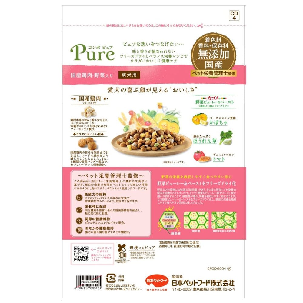 原材料・成分:穀類(トウモロコシ、小麦ブラン、ライスブラン、コーングルテンフィード)、肉類(チキンミール、牛肉粉、豚肉粉、チキンレバーパウダー、フリーズドライ鶏肉)、豆類(脱脂大豆、おから粉末)、油脂類(動物性油脂、植物性油脂(ピュアオリーブオイル含む))、野菜類(カボチャピューレー、トマトペースト、ホウレンソウピューレー、キャベツパウダー、大麦若葉パウダー、カボチャパウダー、トマトパウダー、ニンジンパウダー、ブロッコリーパウダー、ホウレンソウパウダー、モロヘイヤパウダー)、チーズパウダー、ゼラチン、でん粉類(でん粉、デキストリン)、麹菌発酵物、セレン酵母、小魚粉末、オリゴ糖、カゼインホスホペプチド、ミネラル類(カルシウム、リン、ナトリウム、クロライド、鉄、銅、マンガン、亜鉛、ヨウ素、コバルト)、ビタミン類(A、B2、B6、B12、D、E、パントテン酸、コリン)、酸化防止剤(ビタミンE、ローズマリー抽出物)、グルコサミン、アミノ酸類(アルギニン、メチオニン)、コンドロイチン
