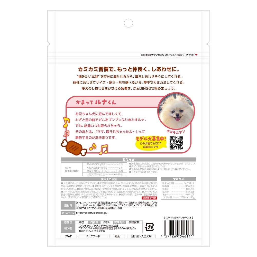 原材料・成分:鶏肉、コーンスターチ、落花生たん白、チーズ、鶏レバー、塩化Na、増粘安定剤(グリセリン、ソルビトール)、保存料(ソルビン酸K、プロピオン酸Ca、デヒドロ酢酸Na)、着色料(二酸化チタン)、発色剤(亜硝酸Na)、香料