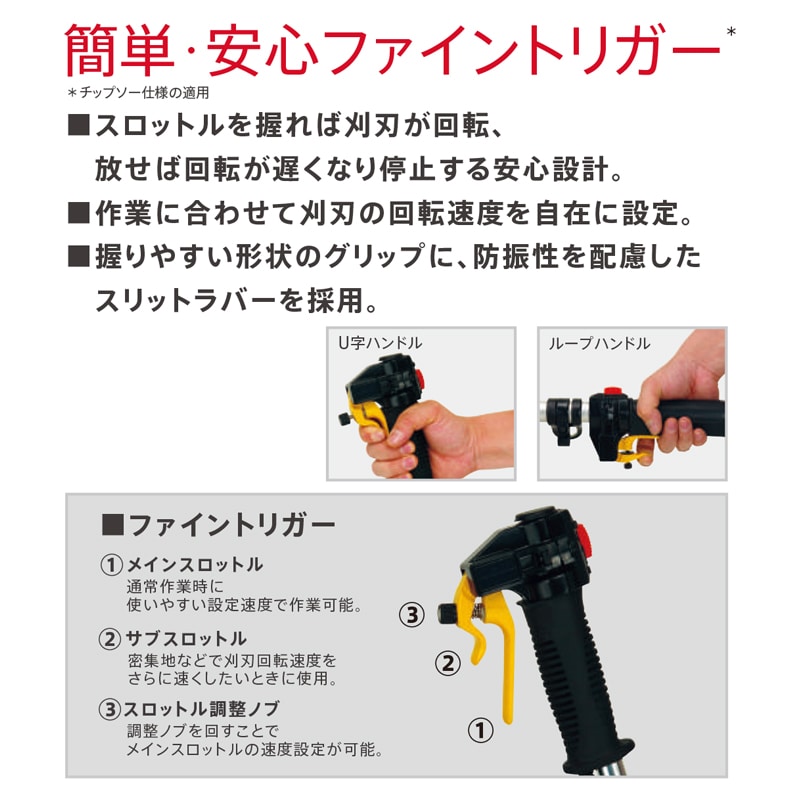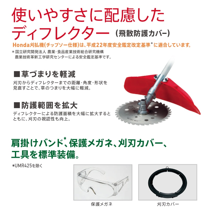 簡単、安心ファイントリガー ■スロットルを握れば刈刃が回転、放せば回転が遅くなり停止する安心設計。 ■作業に合わせて刈刃の回転速度を自在に設定。 ■握りやすい形状のグリップに、防振性を配慮したスリットラバーを採用。 使いやすさに配慮したディフレクター(飛散防護カバー) Honda刈払機(チップソー仕様)は、平成22年度安全鑑定改定基準に適合しています。 *国立研究開発法人 農業食品産業技術総合研究機構 農業技術革新工学研究センターによる安全鑑定基準です。 ■草づまりを軽減 刈刃からディフレクターまでの距離、角度、形状を見直すことで、草のつまりを大幅に軽減。 ■防護範囲を拡大 ディフレクターによる防護面積を大幅に拡大するとともに、刈刃の視認性も向上。 ■肩掛けバンド、保護メガネ、刈刃カバー、工具を標準装備。 【エンジン】 ・名称:GX25T ・種類:空冷4ストローク単気筒OHC ・総排気量 (cm3):25.0 ・最大出力/回転数 (kW(PS)/rpm):0.72(1.0)/7,000 ・使用燃料:自動車用無鉛ガソリン ・燃料タンク容量(L):0.58 ・点火方式:トランジスタ式マグネト点火 ・始動方式:リコイルスターター(手動) ・動力伝達方式:遠心クラッチ 【フレーム】 ・防振装置:クラッチハウジング一体構造 ・刈刃(mm):230mmチップソー〈36チップ〉 ・3軸合成値(振動加速度)(m/s2):5.0 ●HONDAならではの【安心の賠償責任保険が3年分無料】 ご購入いただき、お客様登録をいただきますと、HONDA独自の【賠償責任保険】が3年分無料で付帯いたします。 万が一、使用中に事故を起こして他人にケガをさせてしまったり、他人の物を壊してしまうなど法律上の賠償責任が生じた際に、保険で賠償金をお支払いします。