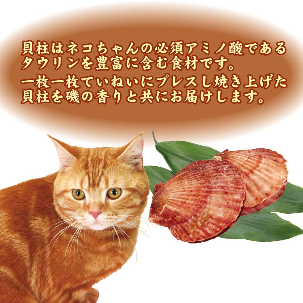 ネコちゃんの必須アミノ酸であるタウリンを豊富に含む貝柱を100%使用。 一枚一枚ていねいにプレスし焼き上げた貝柱を磯の香りと共にお届けします。 保存料・着色料不使用。