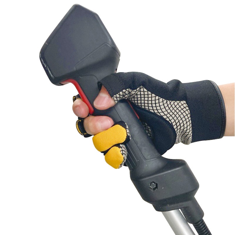 草刈作業用。 振動軽減スポンジを内蔵することで腱鞘炎を予防します。 握り部分に滑り防止用シリコン搭載、刈払機をしっかり握ることが出来ます。 手の甲側には部分的にストレッチ素材を採用しました。 甲側が柔らかくなることで楽な握りを実現しました。
