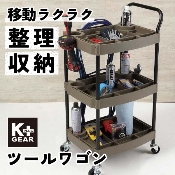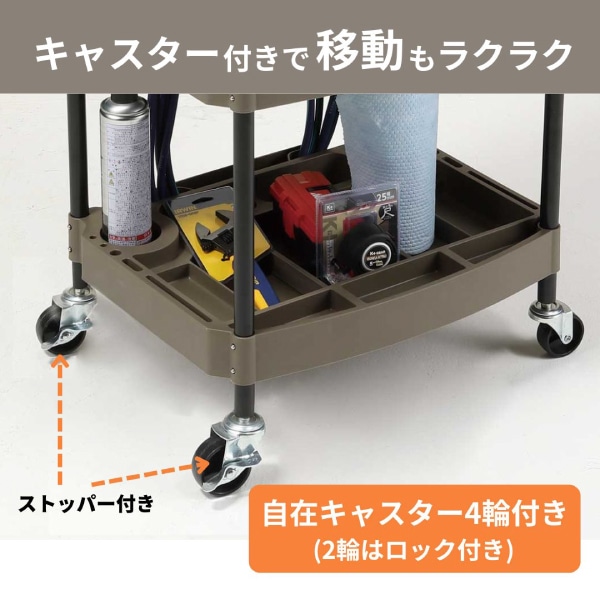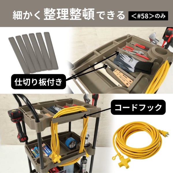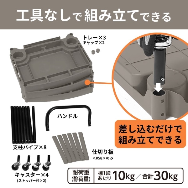 ●必要な道具をしっかり収納 ・工具ホルダー :電動工具やドライバーなどを収納できる ・缶ホルダー :スプレー缶、パーツクリーナーなどのロング缶も収納できる ・コードフック付:延長コードなどをまとめておける ・仕切り版6枚付;各トレーの中央2枚仕切りは脱着可能、道具に合わせて調整できる ●工具不要で簡単組み立て パイプや部品などを差し込むだけ