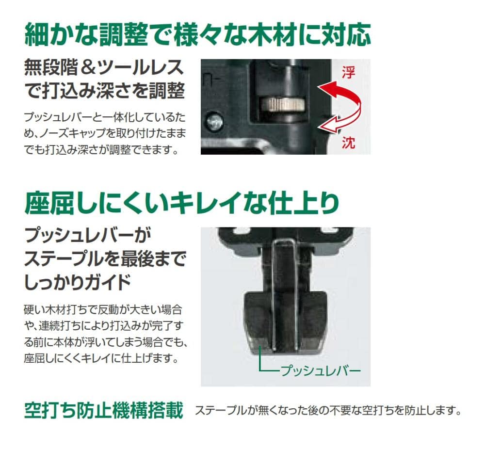 ・36Vブラシレスモーター搭載 ・2灯式LEDライトで、暗い場所でも快適作業 ・2種類のノーズキャップで相手材を傷付けにくくキレイな仕上り ・空打ち防止機構 ・ステープル幅10mm ・1充電あたりの作業量(目安):約4,000本※ ※数値は参考値です。電池の状態や条件により異なります。 【用途】 ・建築、新建材の固定、建築部材製造 ・家具の製造 ・ベニヤ止め作業 ・石こうボード止め作業 ・岩綿吸音板止め作業 ・ラス網止め作業 ・透湿防水シート止め作業