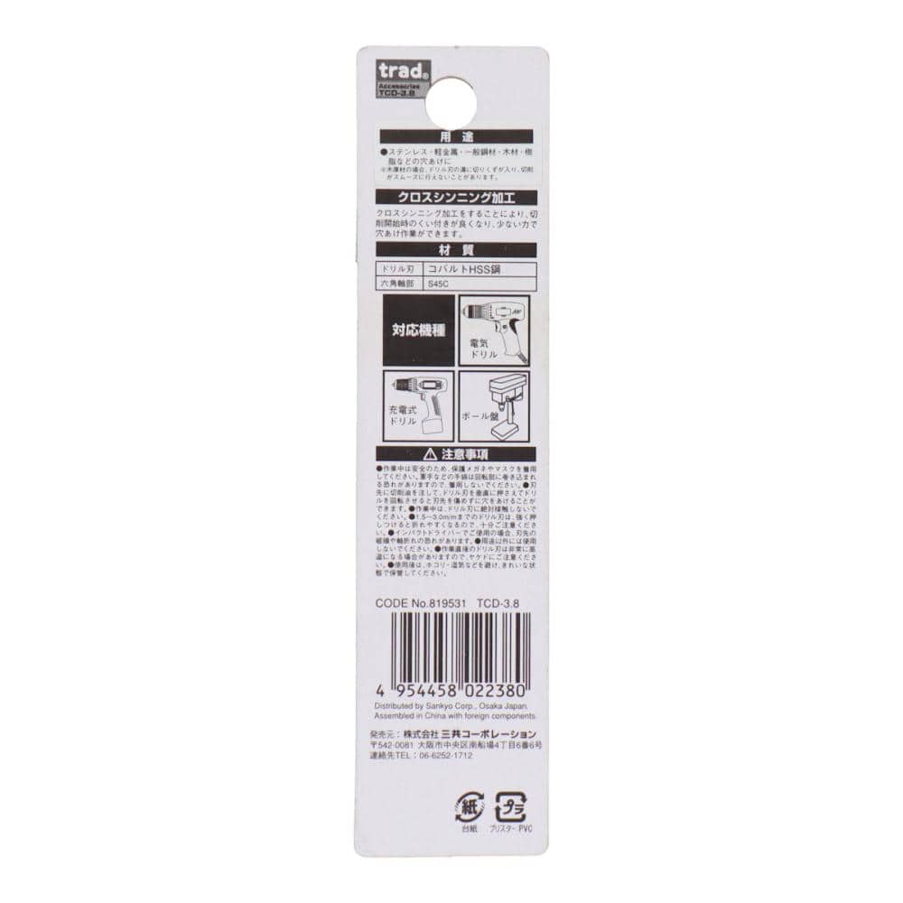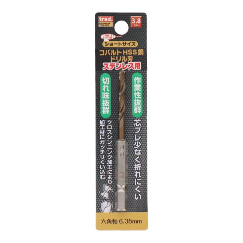 【用途】ステンレス用 【材質】●ドリル刃:コバルトHSS鋼●六角軸部:S45C 【シャンク形状】六角軸6.35mm 【適応機種】●電動ドリル●充電式ドリル●ボール盤