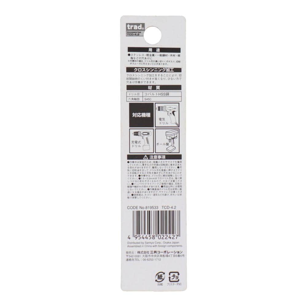 【用途】ステンレス用 【材質】●ドリル刃:コバルトHSS鋼●六角軸部:S45C 【シャンク形状】六角軸6.35mm 【適応機種】●電動ドリル●充電式ドリル●ボール盤