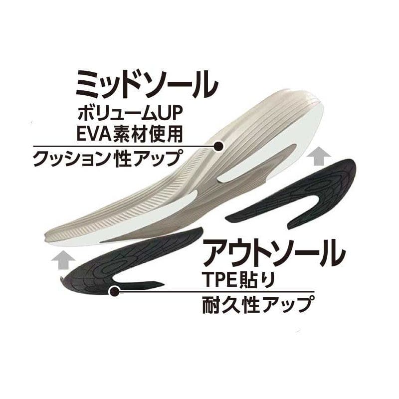●ミッドソール部分に耐久性の高いEVA樹脂を使用してクッション性を高めるとともに、アウトソール部分にTPEというゴムのような弾力性と耐久性を併せ持つ素材を使用し、疲れにくい仕様となっています。