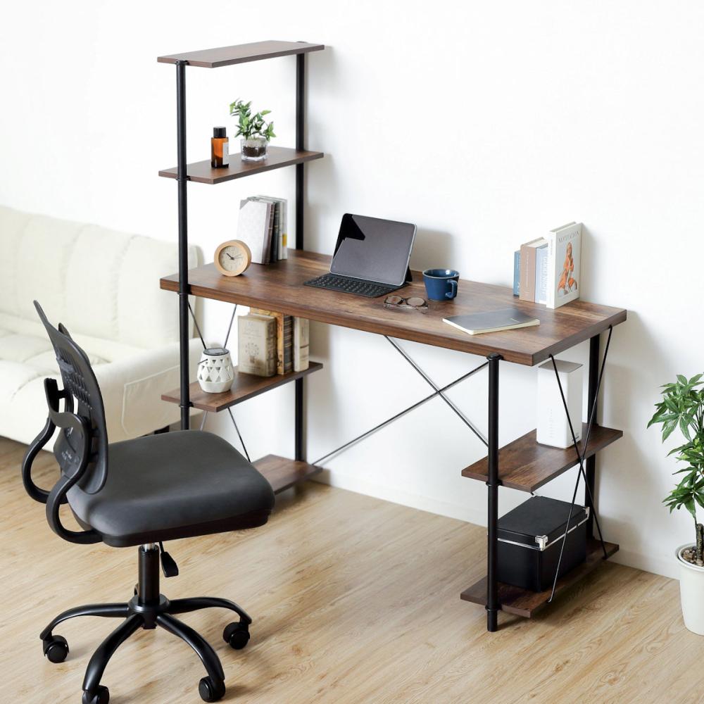 ■工具不要で板にスチールをはめ込むだけの簡単組立です。 ■すぐ手が届く位置にラックがあるので物が取りやすい。 ■幅120cm、奥行56cmのデスクなので広々と快適にデスクワークができます。 ■上段・下段のラック間の高さ内寸は31cmでA4ファイルを収納できます。