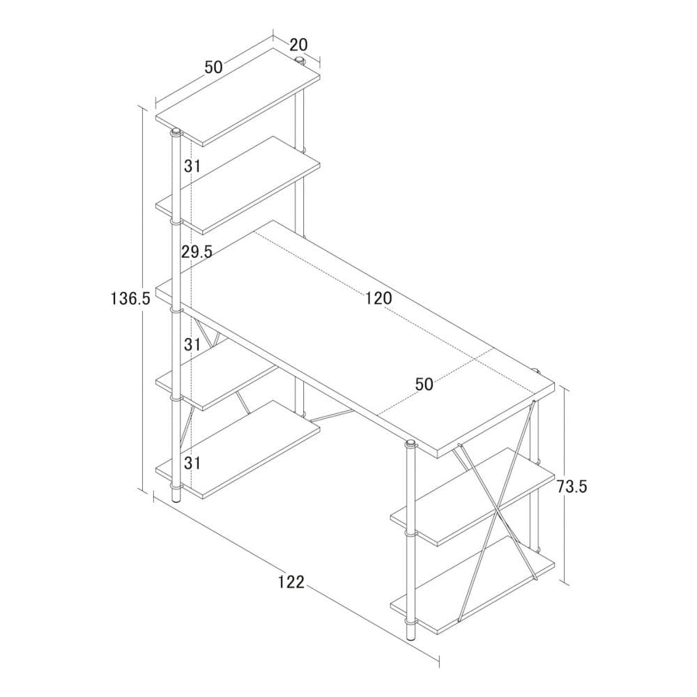 【サイズ】 外寸:約幅122×高さ136.5×奥行56cm デスク甲板内寸:約120×56cm デスク甲板までの高さ:約73.5cm ラック1枚あたり:約幅50×奥行20cm ラック間の高さ内寸:約31cm(A4ファイル収納可) デスク甲板からすぐ上のラック棚までの高さ内寸:約高さ29.5cm(A4ファイル収納不可) 【耐荷重】 天板:15kg ラック棚板:6g 【材質】 プリント紙化粧繊維板、スチール、粉体塗装 【梱包サイズ】 1梱包:約144×9×70cm 約21kg ※お客様組立商品/工具不要