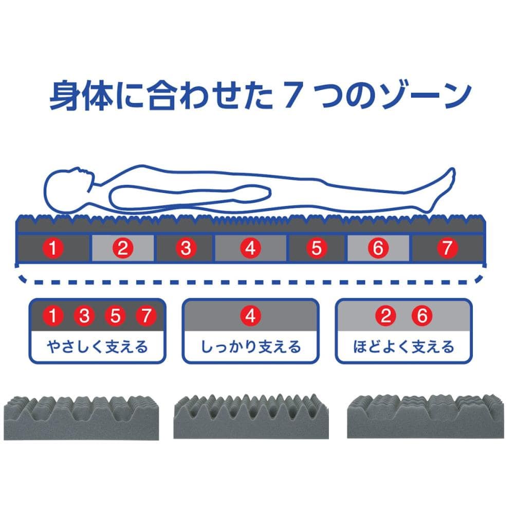■昭和西川の「寝ればわかるシリーズ」とは 健康で元気な毎日をいい眠りで応援したい!そんな想いを実現するために、快適な形状、硬さ、フィット感を研究開発した特殊構造ウレタンを使用したマットレスシリーズです。 【ポイント1】きめ細やかなウレタン構造で理想的な寝姿を実現 異なる形状の3種類のウレタンを、身体の7つのゾーンに合わせて配置。一番沈み込みやすい臀部は「しっかり支える」ウレタン。肩、腰、膝、足部は「やさしく支える」ウレタン。肩、ふくらはぎ部は「ほどよく支える」ウレタン。 【ポイント2】通気性が良くムレにくい ウレタンの凸凹の空間部分が空気の通り道になり、背中にまとわりつく嫌な湿気を発散します。 【ポイント3】様々な寝姿勢に対応/寝返りもスムーズ 身体に合わせた構造が、仰向け寝、横向き寝による肩や腰への負担を軽減します。ほどよい硬さで無理なく寝返りもサポート。 【ポイント4】仰向け寝、横向け寝に対応 身体に合わせた3種類のウレタン構造が肩や腰への負担を軽減するので、仰向け寝でも横向け寝でも快適。 【ポイント4】側地は丸洗いOK 側地は取り外して洗濯機で丸洗いできます(洗濯ネット使用)。※中のウレタンは洗濯できません。中のウレタンを出し入れしやすいL字ファスナー仕様。 【ポイント6】ベッドでも、フロアでも使えます ベッドマットレスの上に重ねて使えるのはもちろん、厚み9cmなので床に直接敷いて1枚でもご使用いただけます。 【ポイント7】お手入れ簡単 三つ折りなのでジグザクにすれば自立させることができます。使わない時は風通しの良い所に立てかけて置くだけで湿気を逃すことができます。