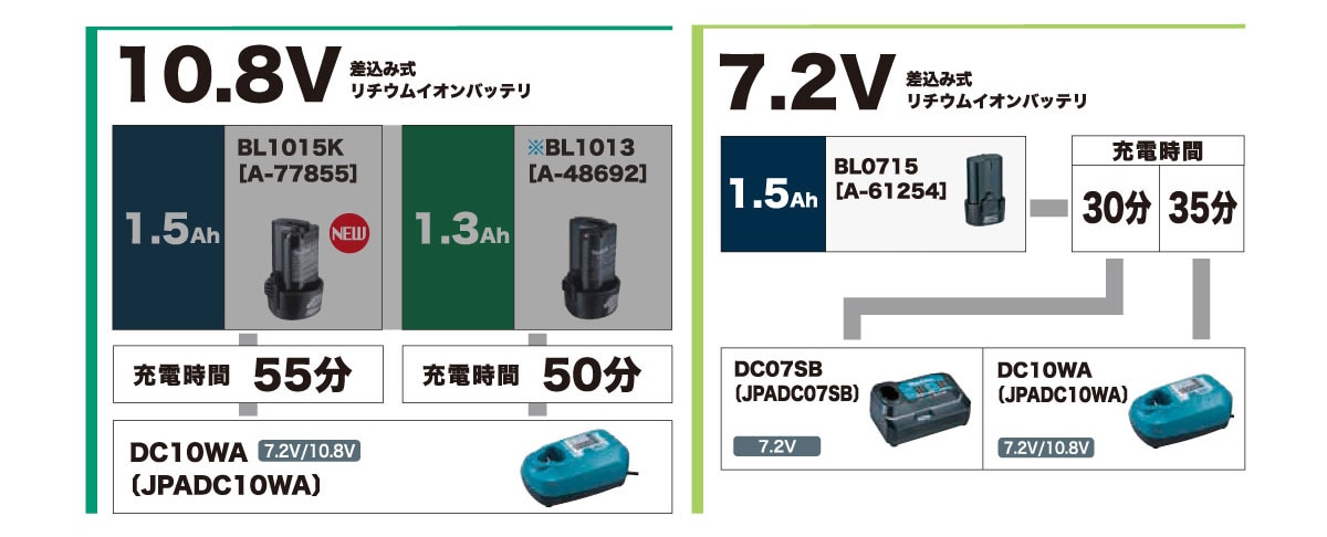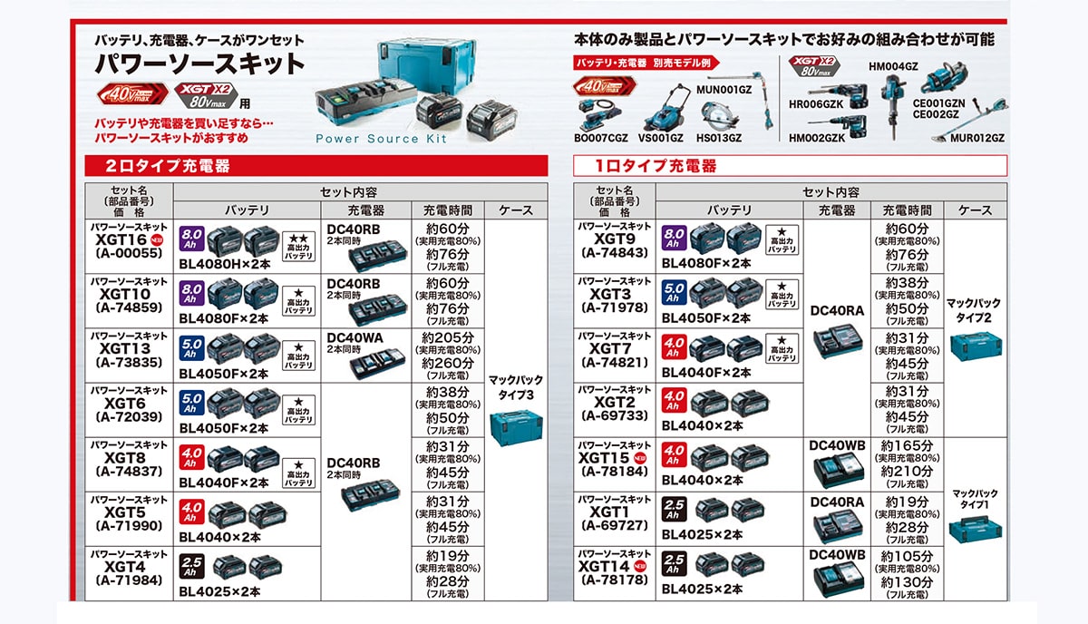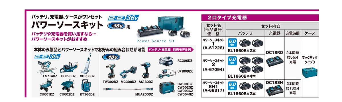 バッテリーや充電器を買い足すなら、パワーソースキットがおすすめです。本体のみの製品とお好みの組合せができます。