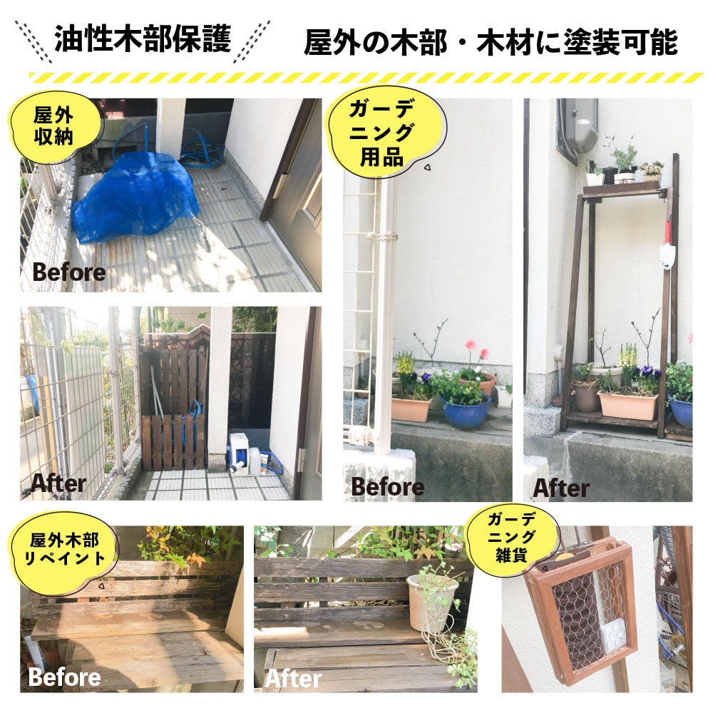 ●日焼け(紫外線)による木材の色あせを防止します。 ●木材に浸透し、木目を生かした半透明着色仕上げになります。 ●水性木材保護塗料と比べ、木材への浸透性が高く、中からしっかりガード! ●塗れないもの:常に水がかかる所、食品と接触する所 / 食器が置かれる所、室内・密閉性がある場所、火気のある場所、乾燥していない木部 ●乾燥・塗り重ね時間:20℃ 乾燥時間:約 8時間 塗り重ね時間:約2時間以上 冬期 乾燥時間:約12時間 塗り重ね時間:約2時間以上 ●塗り面積(2回塗り):約15~21.3m2(タタミの広さ:約9~13枚分)
