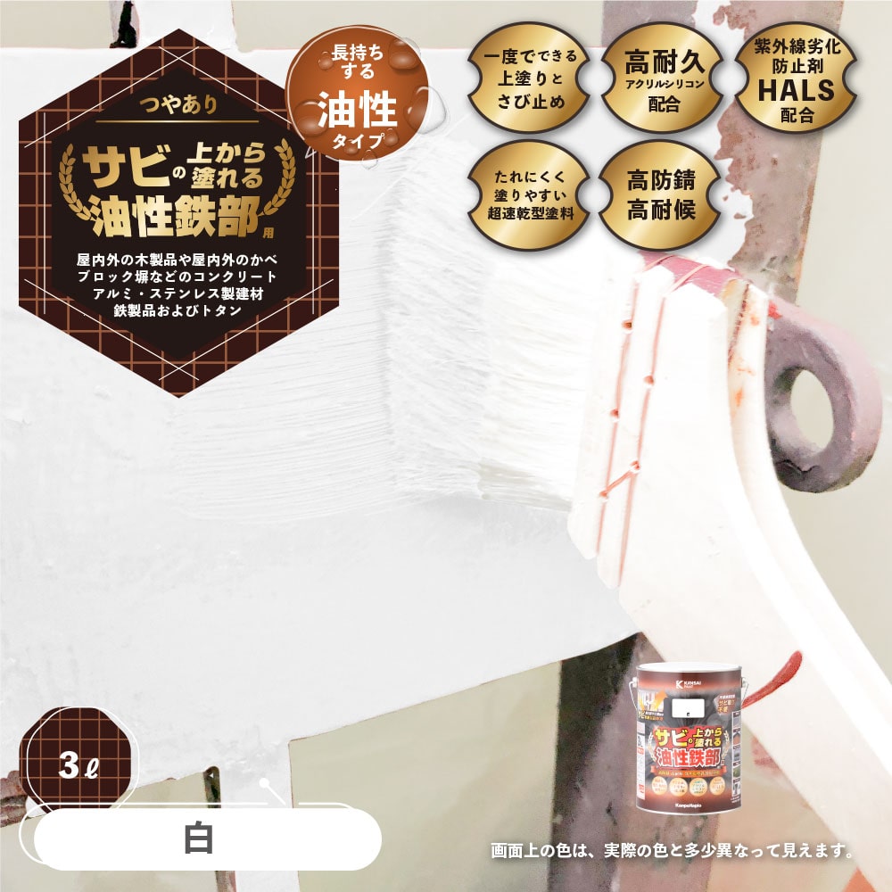 ●強力防サビ剤が防請効果を発揮し、サビ止めと上塗りが時にできます。 ●たれにくく塗りやすい速乾型塗料なので作業性が抜群です。 ●用途:鉄製品およびトタン(門扉・フェンス・物置など) アルミ・ステンレス製建材(サッシ・カーポートなど) 屋内外の木製品(板べい、ドア、ガーデニング用品など) 屋内外のコンクリート(屋内外のかべ、ブロック塀など) ●乾燥時間:20℃:約1.5時間(塗り重ねる時は5時間以上) 冬期:約4時間(塗り重ねる時は8時間以上) ●塗り面積(1回):24~33m2(タタミの広さで約18枚分) ●危険物分類:一般色非危険物(指定可燃物)