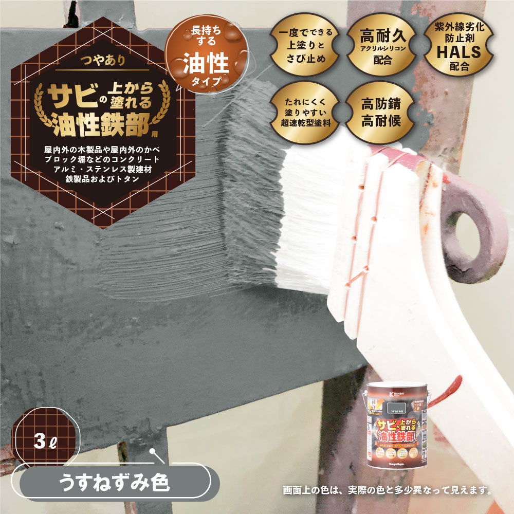 ●強力防サビ剤が防請効果を発揮し、サビ止めと上塗りが時にできます。 ●たれにくく塗りやすい速乾型塗料なので作業性が抜群です。 ●用途:鉄製品およびトタン(門扉・フェンス・物置など) アルミ・ステンレス製建材(サッシ・カーポートなど) 屋内外の木製品(板べい、ドア、ガーデニング用品など) 屋内外のコンクリート(屋内外のかべ、ブロック塀など) ●乾燥時間:20℃:約1.5時間(塗り重ねる時は5時間以上) 冬期:約4時間(塗り重ねる時は8時間以上) ●塗り面積(1回):24~33m2(タタミの広さで約18枚分) ●危険物分類:一般色非危険物(指定可燃物)