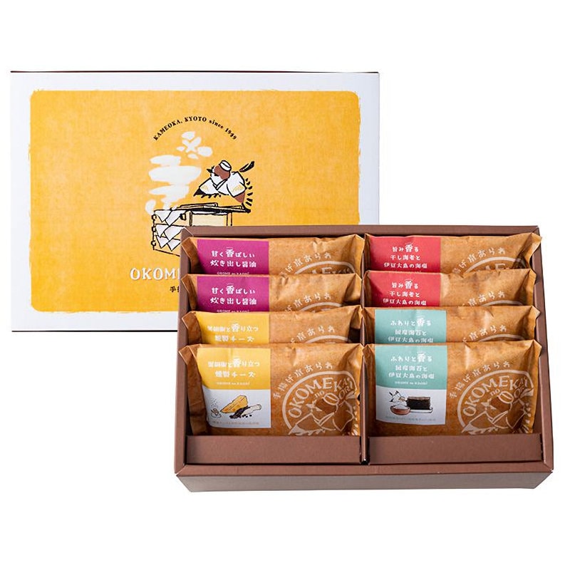 内容量:手揚げ京あられ×8袋(旨み香る干し海老と伊豆大島の海塩16g・甘く香ばしい炊き出し醤油15g・ふわりと香る国産海苔と伊豆大島の海塩17g・黒胡椒と香り立つ燻製チーズ14g×各2袋)