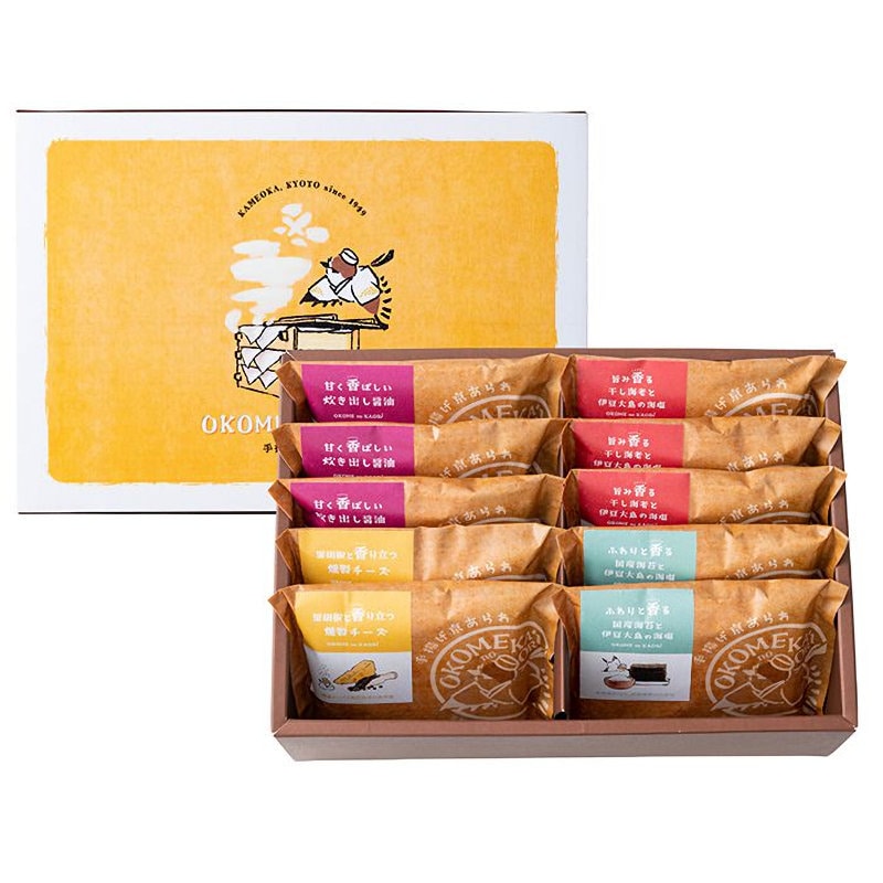 内容量:手揚げ京あられ×10袋(旨み香る干し海老と伊豆大島の海塩16g・甘く香ばしい炊き出し醤油15g×各3袋、ふわりと香る国産海苔と伊豆大島の海塩17g・黒胡椒と香り立つ燻製チーズ14g×各2袋)