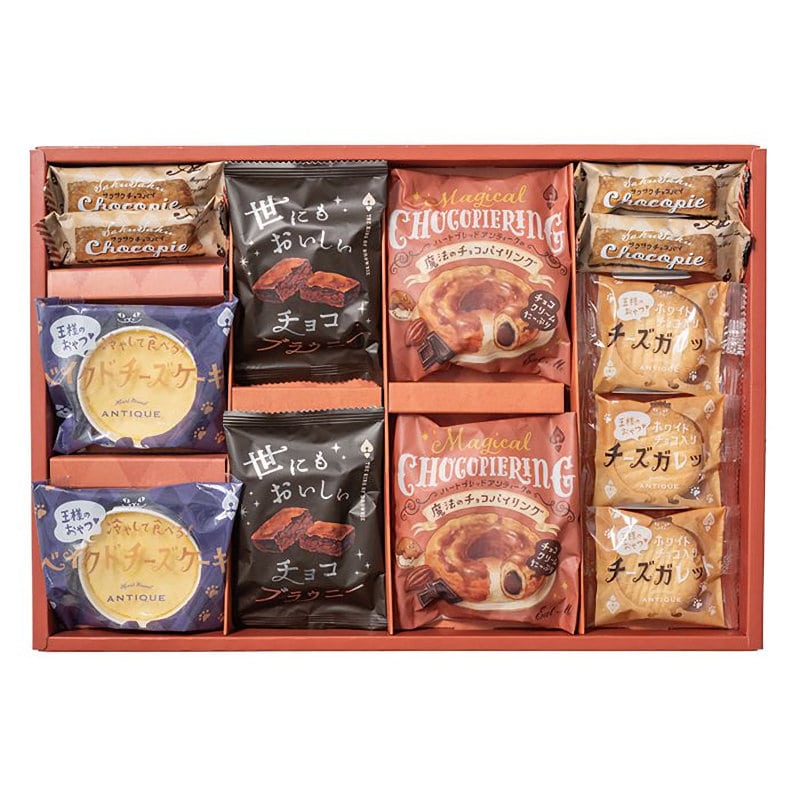 内容量:サクサクチョコパイ×4個、ホワイトチョコ入りチーズガレット×3個、世にもおいしいチョコブラウニー・冷やして食べる!ベイクドチーズケーキ・魔法のチョコパイリング×各2個