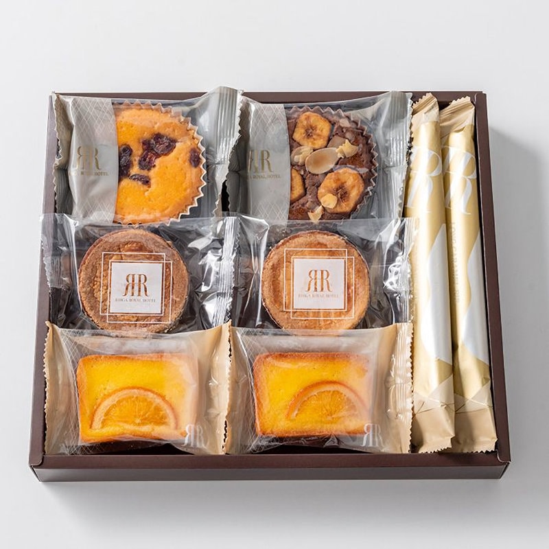 しっとり生地にフルーツやナッツを飾ったプチケーキやオレンジケーキ、さくっとした食感の中にキャラメルの風味が香る少し長いサイズのロングパイ、アーモンドが香ばしく香るフランス伝統の厚焼きクッキーと、ホテルの豊かなティータイムを演出するスイーツを詰め合わせました。