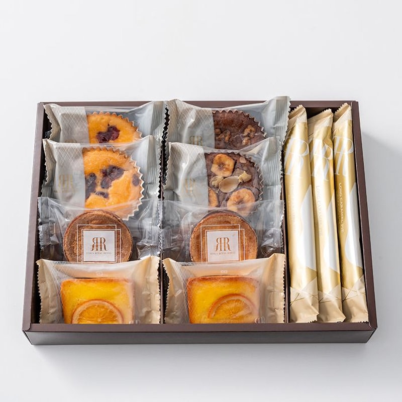 しっとり生地にフルーツやナッツを飾ったプチケーキやオレンジケーキ、さくっとした食感の中にキャラメルの風味が香る少し長いサイズのロングパイ、アーモンドが香ばしく香るフランス伝統の厚焼きクッキーと、ホテルの豊かなティータイムを演出するスイーツを詰め合わせました。