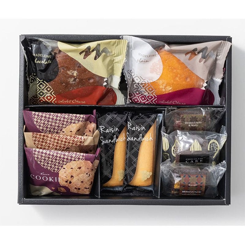 ホテルオークラの焼菓子の詰合せ。チョコレートのほろ苦さを凝縮させたブラウニー、しっとりした焼きあがりのマドレーヌなどさまざまな焼菓子を取り揃えているのにも、選ぶ、味わう楽しさを届けたいというおもてなしの心を感じて頂けるセットとなっています。
