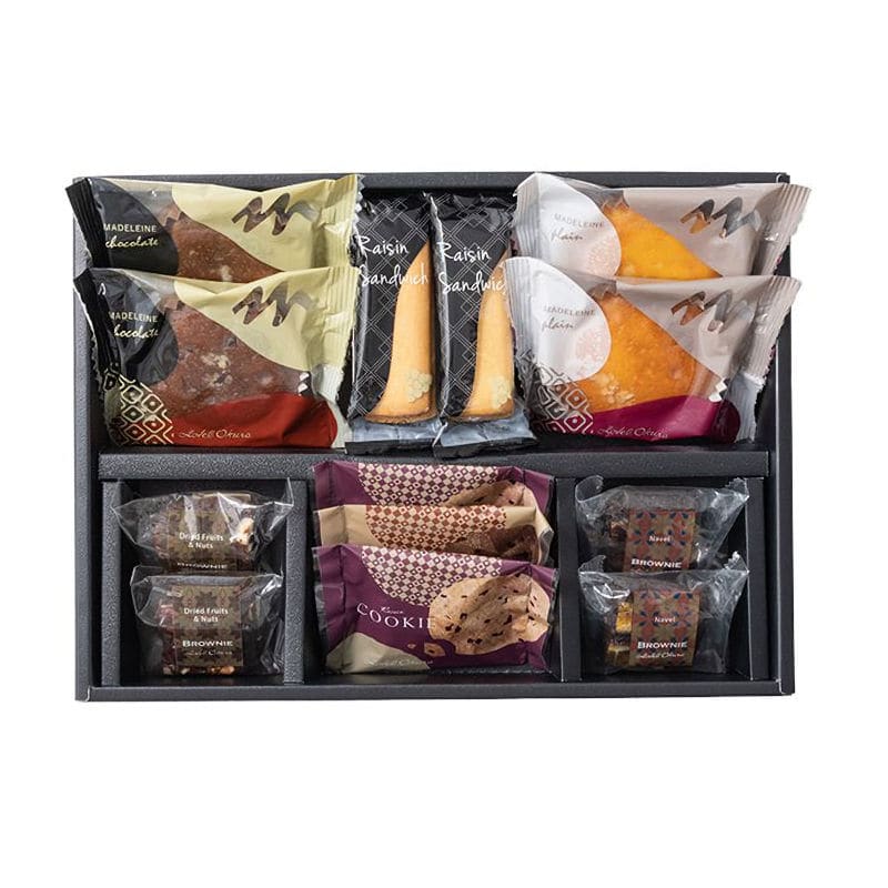 内容量:ブラウニー(ネーブル・ドライフルーツ&ナッツ)・レーズンサンド・マドレーヌ(プレーン・チョコ)・レーズンクッキー×各2個、チョコチップクッキー×1個