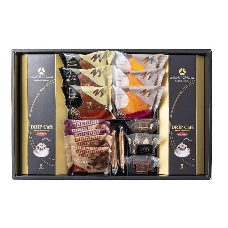 ホテルオークラの焼菓子とドリップ珈琲の詰合せ。しっとりした焼きあがりのマドレーヌやレーズンサンドなどさまざまな焼菓子を取り揃えているのにも、選ぶ、味わう楽しさを届けたいというおもてなしの心を感じて頂けるセットとなっています。焼菓子に良くあう上品な味わいのドリップ珈琲と一緒にご堪能ください。
