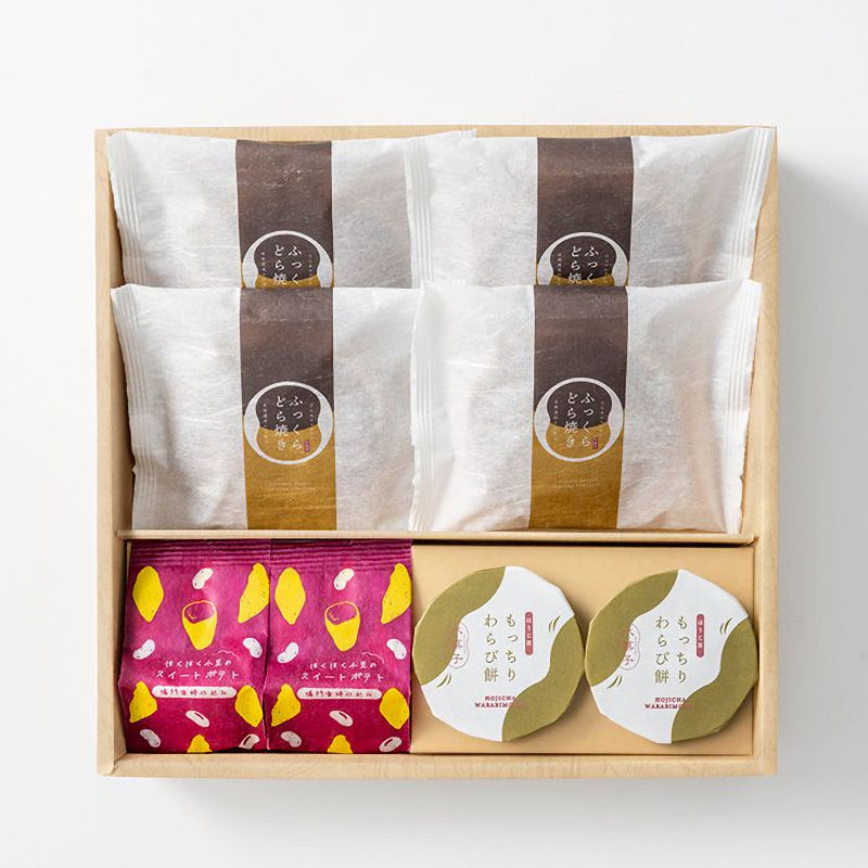 内容量:ふっくらどら焼き×4個、もっちりわらび餅×2個、ほくほく小豆のスイートポテト×2個