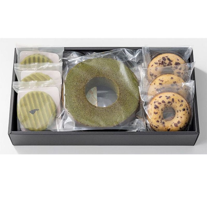 元禄年間創業の老舗「丸久小山園」の宇治抹茶を使用した上品で芳醇な香りが広がるバウムクーヘン。優しい甘さの小豆の焼きドーナツに厚みのある波型クッキーに、口どけの良いクリームをサンドしたヴァッフェルもご一緒に。