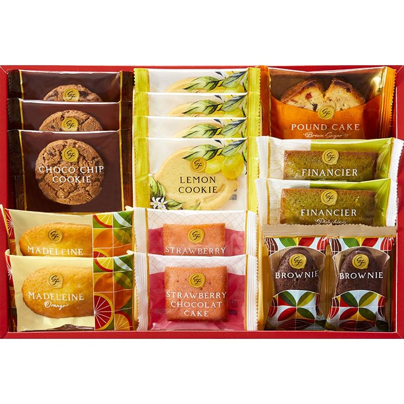 内容量:オレンジマドレーヌ×2個、ストロベリーショコラケーキ×2個、ピスタチオフィナンシェ×2個、ブラウニー×2個、ブラウンシュガーパウンドケーキ×1個、チョコチップクッキー×3個、レモンクッキー×4個