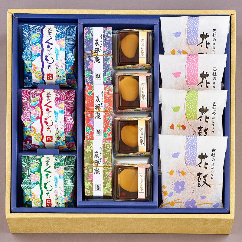 内容量:くずもち(純・桜・抹茶×各1)、友禅庵(粒・梅・茶×各1)、のれん栗×4、花鼓×4