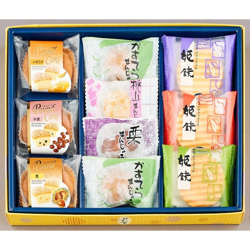 パウンドケーキ3種類とまんじゅう3種類、姫鏡3種を、バラエティ豊かに詰め合わせたギフト商品です。
