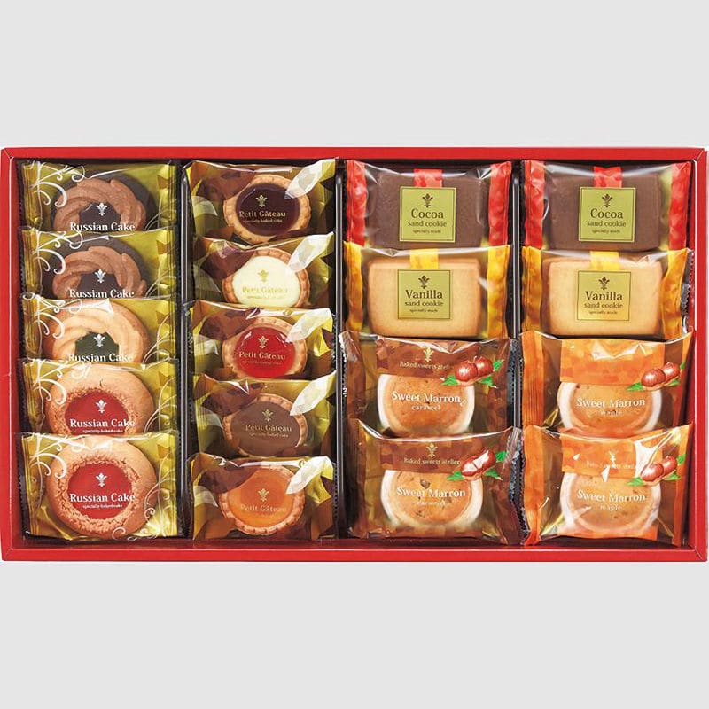内容量:ロシアケーキ(マカロンストロベリー・リッチビター)・サンドクッキー(ココア・バニラ)・スイートマロン(メープル・キャラメル)×各2、ロシアケーキ(フラワーキウイ)・プチガトー(ストロベリー・ブルーベリー・オレンジ・ミルクチョコ・ホワイトチョコ)×各1