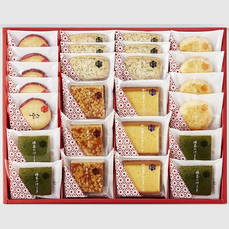 内容量:和三蜜のかすていら×3、栗のけーき×3、抹茶のけーき×4、くるみ餡のぱい×4、さつまいものがれっと×5、黒ごまの薄板くっきい×6